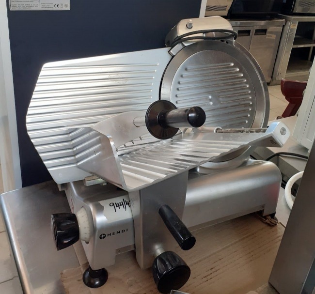 Used professional meat slicer Hendi Profi Line 300, high-precision. Features a 300mm diameter blade. In good condition. Price: 250€/pc