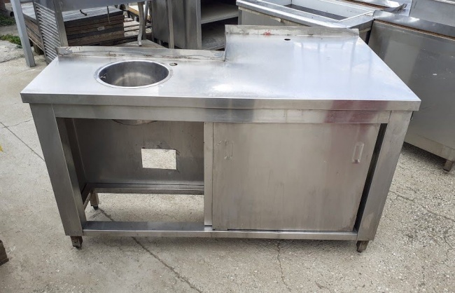 Μεταχειρισμένος, ανοξείδωτος πάγκος- ερμάριο, γωνιακό, με 2 συρόμενες πόρτες και μικρή λάντζα. Σε καλή κατάσταση. Διαστάσεις: 141x77x82εκ. Τιμή: 150€.