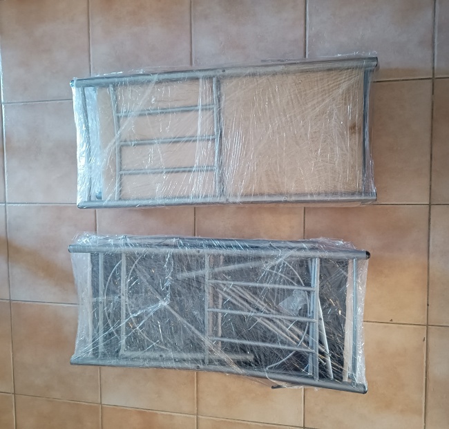 4 μεταλλικές καρέκλες με υφασμάτινο κάθισμα. Και το τραπέζι και οι καρέκλες μπορούν να αποσυναρμολογηθούν,οι καρέκλες είναι ήδη αποσυναρμολογημένες και συσκευασμένες ανά 2.