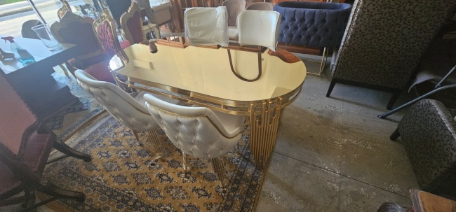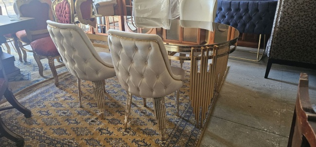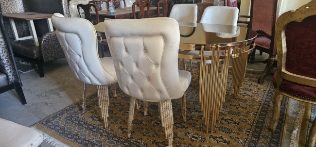 Πωλείται καινούριο σετ τραπεζαρίας με έξι καρέκλες ντυμένες με βελούδο.