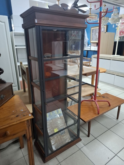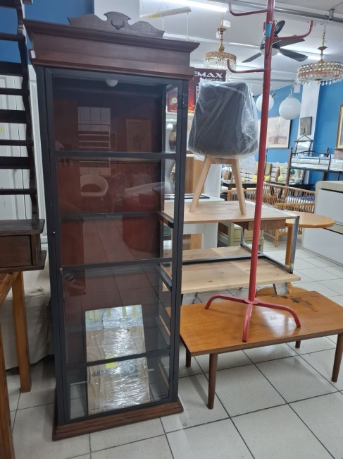 Μεταχειρισμένη ξύλινη προθήκη με ράφια από τζάμι και σκαλιστές λεπτομέρειες. Σε καλή κατάσταση. Διαστάσεις: 61x35x170 εκ. Τιμή: 170€